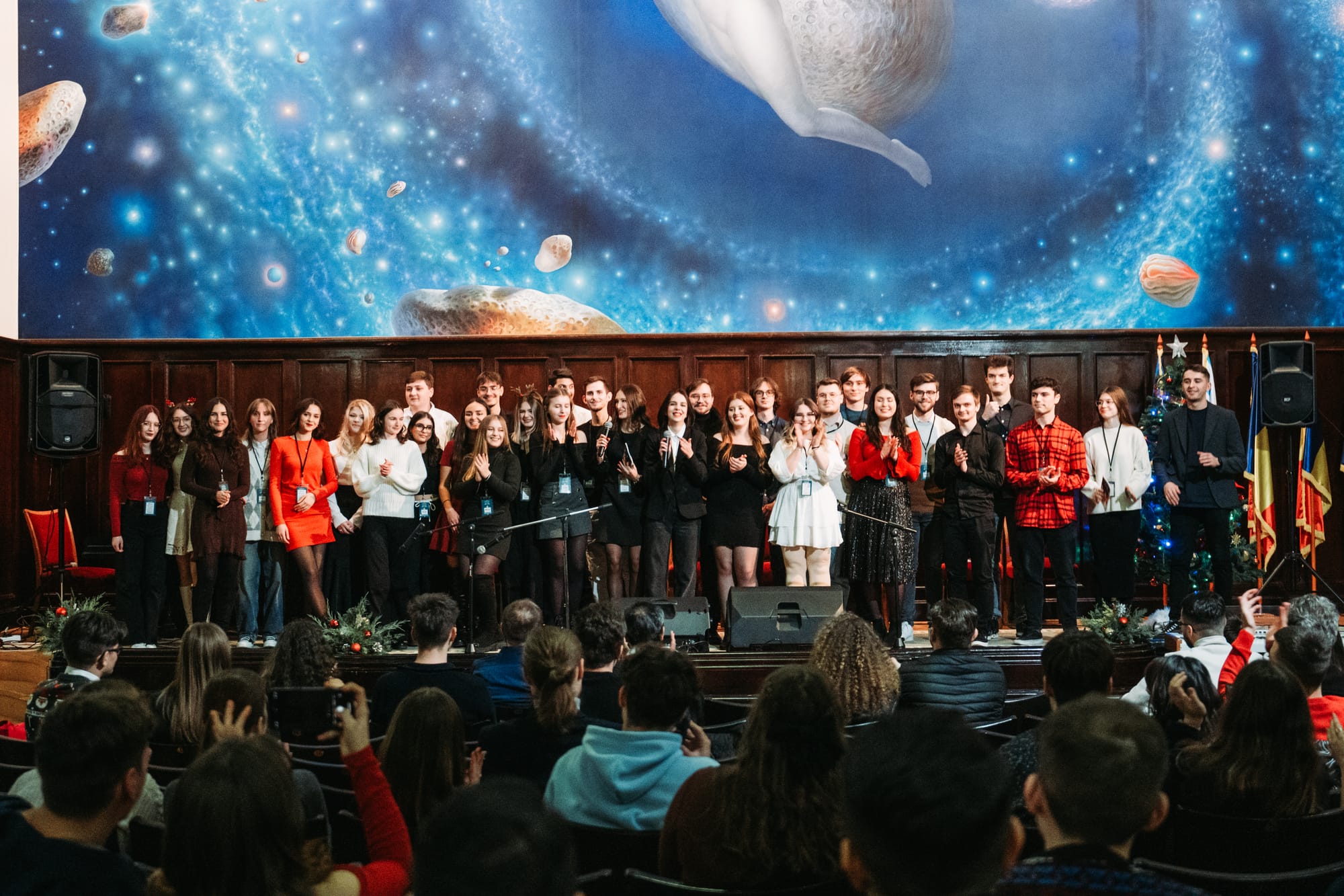 Pe măsură ce sala se umplea de forfota participanților, iar moșuleții din clei își găseau noi stăpâni, atenția tuturor s-a mutat spre Aula Magna Mihai Eminescu, unde urma să înceapă spectacolul de Crăciun. Seara care s-a transformat în zi a fost deschisă de vocile calde ale membrilor corului ASII. Am resimțit mai multe emoții decât la repetiții, însă eram entuziasmată să văd produsul final al orelor petrecute la cor. Văzând fețele zâmbitoare din public în timpul colindelor, am simțit că munca ne-a fost răsplătită și că totul a meritat din plin, povestește Irina Grigorciuc.
