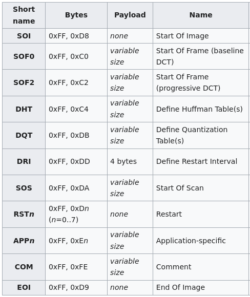 Mai sus sunt câteva perechi de octeți cu care se marchează începutul unor blocuri de informații din structura imaginii. O să vă lăsăm pe voi să intrați în detalii dacă doriți, dar putem chiar vedea câțiva dintre acești octeți la începutul afișării de mai sus. În special, vedem că folosind marcatorul COM, putem introduce un comentariu text, cu orice vrem noi, fără a schimba datele imaginii. Mai mult, după marcatorul EOI, orice octet va fi ignorat, deci putem adăuga un mesaj.